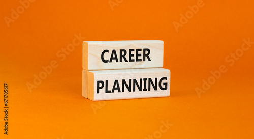 Career planning symbol. Concept words Career planning on beautiful wooden block. Beautiful orange table orange background. Business, motivational career planning concept. Copy space.