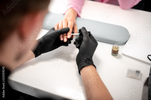 Careful professional manicurist touching the hand of his client while doing the manicure on her nails