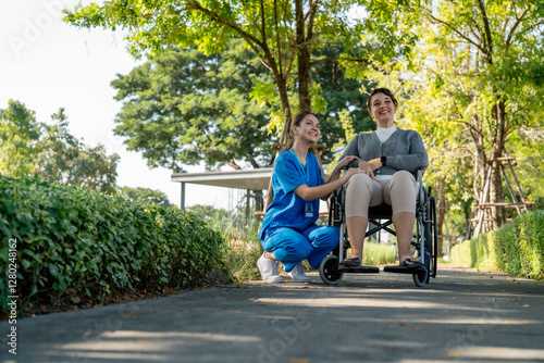 caregiver assists woman in wheelchair during sunny day in park, showcasing compassion and support