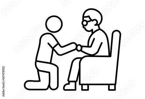 Caregiver Holding Hands with Senior, Minimal Line Illustration of Compassionate Support, Symbol for Elderly Care, Nursing, Counseling, Healthcare, and Community Welfare