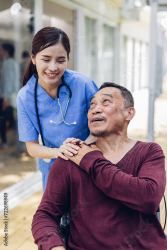 Caregiver nurse take care a Senior patient outside home. Nurse helping senior people.