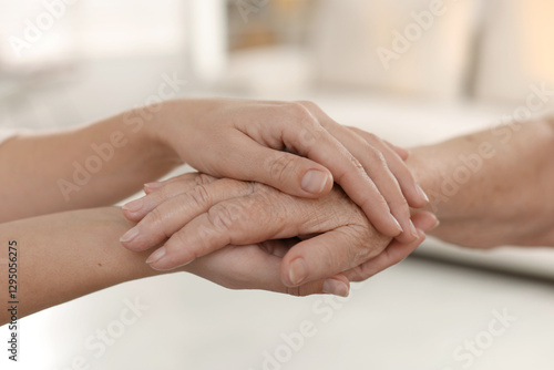 Caregiver supporting senior woman on light background, closeup. Elderly care
