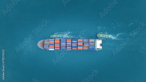 Cargo Container Ship running with with Tugboat. container ship import export to customers sea port. export shipping industry freight and transportation logistics concept.