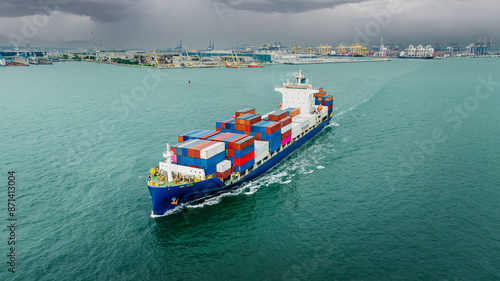 cargo container ship sailing in sea to import export goods and distributing products to dealer and consumers worldwide, by container ship Transport business delivery service, aerial view