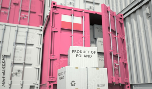 Cargo containers and boxes with products from Poland. National industry related conceptual 3D rendering