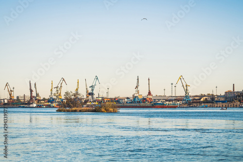 cargo cranes at the port by the river