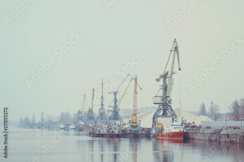 Cargo dock ship-lifting cranes in the harbor, Cargo river port terminal container