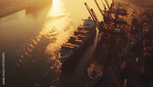 Cargo ship at sunrise harbor, cranes loading, aerial view