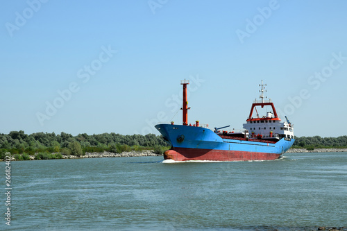 Cargo ship (bulk carrier) floats on the Danube river. Sulina, Danube Delta, Romania.