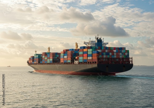 Cargo ship carrying containers sailing on the ocean under a cloudy sky