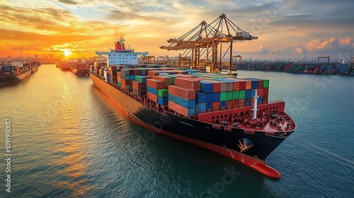 Cargo ship docked at a busy port, ready for departure