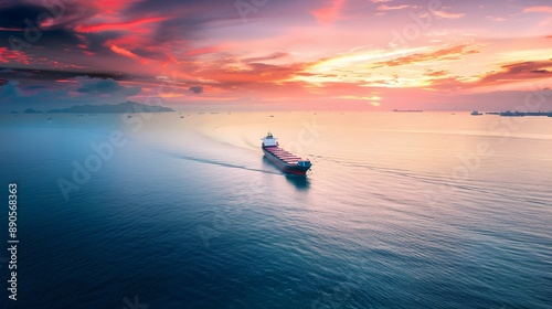 Cargo Ship Sailing on Calm Ocean Water at Sunset