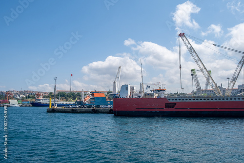Cargo ships docked at a busy harbor with cranes and a clear blue sky in the background during midday