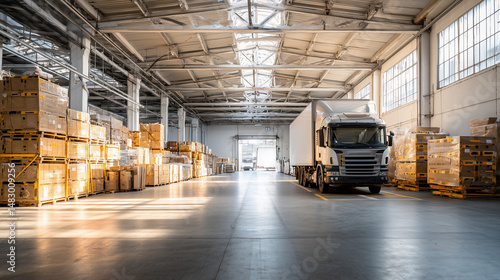 Cargo truck in a clean, organized warehouse, showcasing efficient logistics and industrial simplicity.