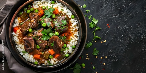 Caribbean-inspired Oxtail Stew with Rice, Peas, and Fresh Herbs. Concept Caribbean cuisine, Oxtail stew, Rice and peas, Fresh herbs, Cooking inspiration