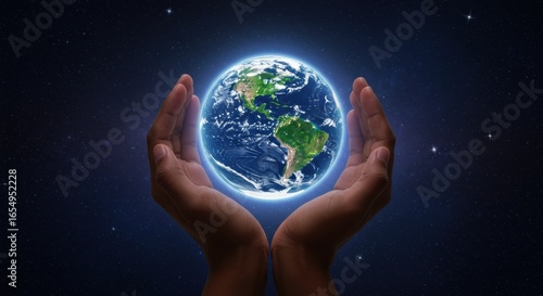 Caring hands cradle glowing Earth in vast starry cosmos, symbolizing hope and global connection