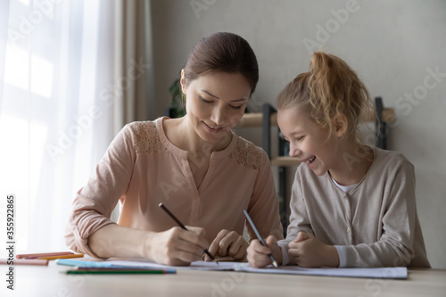 Caring young Caucasian mom or nanny have fun drawing in album with little preschooler girl child, playful happy mother engaged in funny hobby artistic activity, painting with small daughter at home