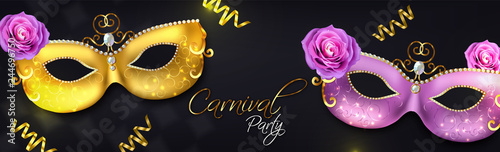 Carnival golden and purple mask Vector realistic. Stylish Masquerade Party. Mardi Gras card invitation. Night Party Poster. Dance Flyer. Musical festival banner templates
