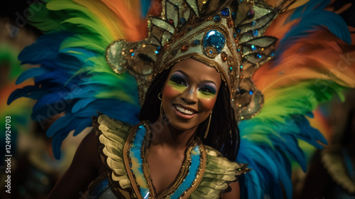 Carnival in Rio de Janeiro, a vibrant parade with dancers in dazzling feathered costumes adorned with sparkling gemstones, samba performers filling the street with rhythm and joy, colorful floats with