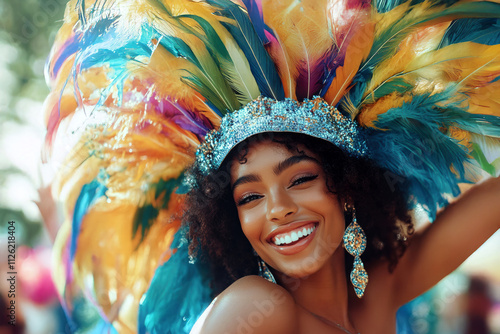 Carnival performer celebrating in colorful feathered costume during vibrant outdoor festival