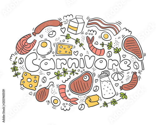 Carnivore diet doodle color. Meet, cheese, eggs, fish, steak, rosemary,pepper. Healthy food. Be carnivore. Diet logo.