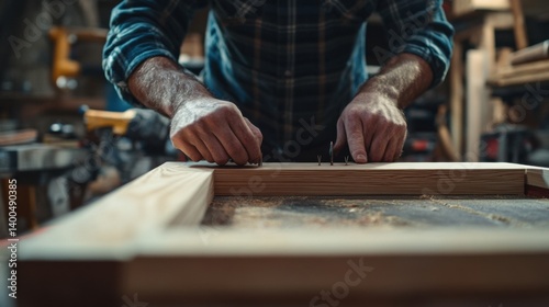 Carpenter assembling a wooden frame for a custom door. Featuring focus and detail