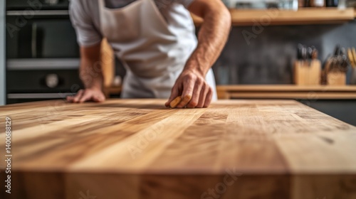 Carpenter fitting a wooden countertop in a kitchen. Featuring craftsmanship and detail