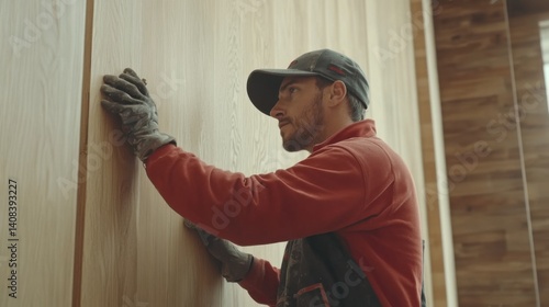 Carpenter installing wooden panels on a wall. Featuring skill and precision