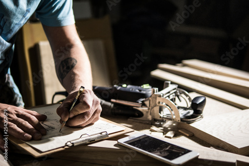 Carpenter left-handed makes notes in the drawings, slotting router and phone on the workbench