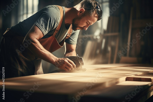 Carpenter man attend to making masterpiece woodworks handcrafted furniture fine measure in wood workshop.