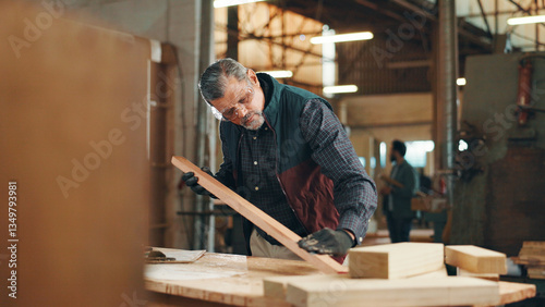 Carpenter, mature and check wood for construction, furniture or renovation project planning. Woodworker, person and plank with tools in creative carpentry workshop for manufacturing, art and craft