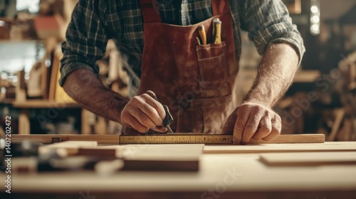 Carpenter measuring wood for a custom bookshelf in a home office. Featuring precision and craftsmanship