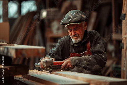 Carpenter sanding wood boards with professionalism, hard construction work and experienced craftsmanship