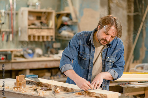 Carpenter taking measurement of a wooden plank. Empty space for text