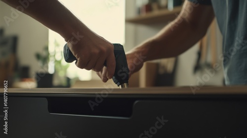 Carpenter using power drill to assemble furniture. Featuring precision and craftsmanship