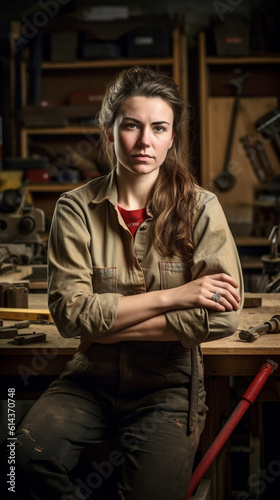 Carpenter woman portrait. Created with generative Ai technology.