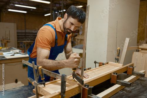 Carpenter working at workbench with clamps that allow to fix wooden workpiece