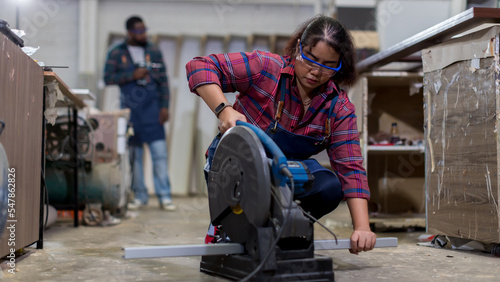 Carpenter working in carpentry shop. Carpenter working and steel cutting machine in wood workshop.
