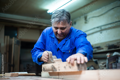 carpenter working in workshop, a worker planing a tree with a planer