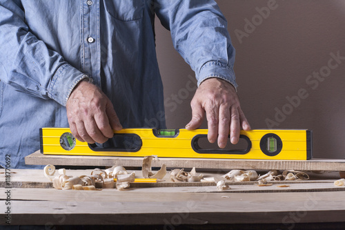 Carpenter working with plane on wooden background at Building Site. Joiner workplace