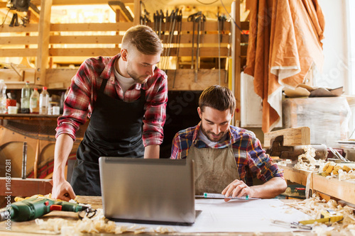 carpenters with laptop and blueprint at workshop