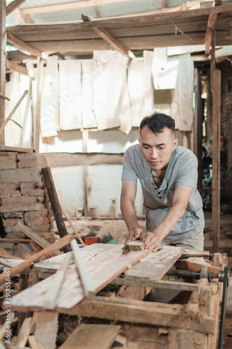 carpenters work using traditional dowels to smooth the surfaces of wood planks in workshop