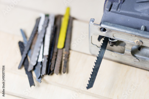 Carpentry tools on a wooden workshop table. Saw and other carpentry accessories while working in a carpentry workshop.