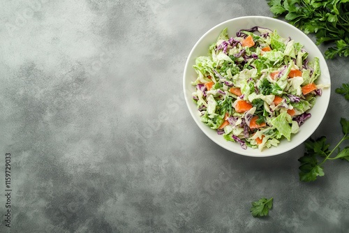 Carrot and cabbage salad in a white bowl with empty space on the left