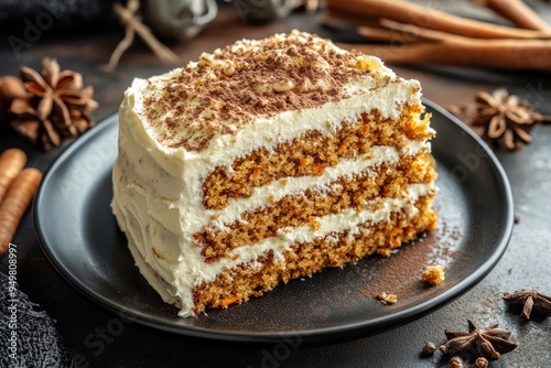 Carrot Cake, A moist cake made with grated carrots, often spiced with cinnamon and topped with cream cheese frosting.