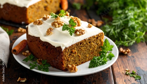 Carrot cake slice with cream cheese frosting, walnuts, and parsley garnish