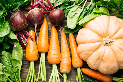 carrots, beets, spinach, pumpkin on a wooden background, fresh vegetables