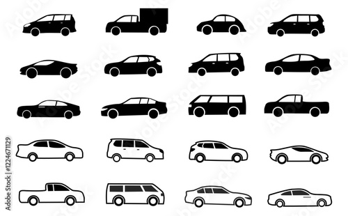 Cars icon vector illustration, set of vehicle symbol black and white color