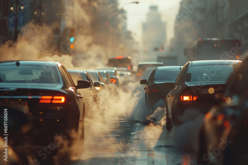 Cars in exhaust gas in a traffic jam
