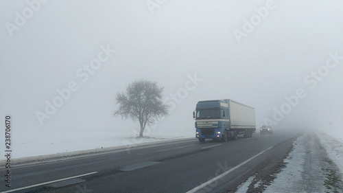 Cars in the fog. Bad winter weather and dangerous automobile traffic on the road.